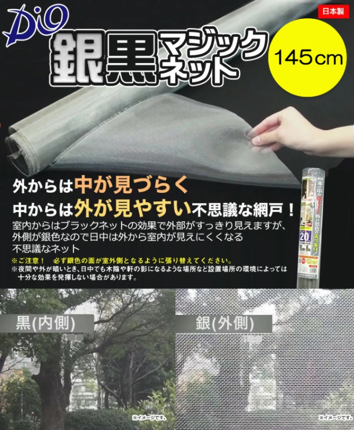 ・ネットは銀色の面を外にすることで、光の反射を利用して目隠し効果を発揮します。したがって外が暗いとき、日中でも木陰や軒の影になるような場所では十分な効果を発揮しない場合があります